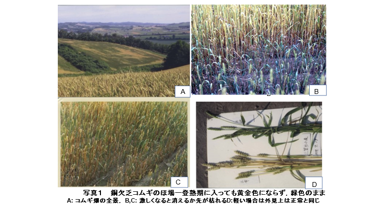 銅は植物に必須の栄養素である.銅を欠乏するとムギ類の場合は子実が入らないのである.コムギの場合,農家は収穫期になってはじめてコムギに実が入っていないことに気が付く.銅欠乏の出た畑では写真1-Aのように,収穫期のコムギ畑はまだら模様になって黄金色となったところと緑のままの所が出てくる.緑のところのコムギは実が入っていないのである.もし秋まき小麦であったなら,銅欠乏の激しいところは春先から成長せず,収穫期になっても穂も出ない状態になる(写真1-B).