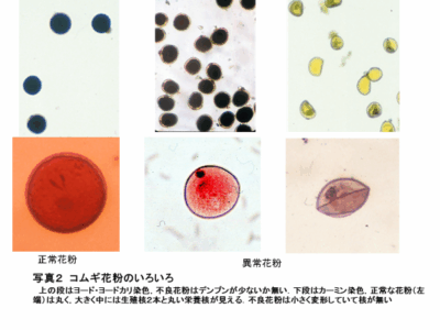 花粉の状態を写真2に示した.これからもわかる通り,正常な花粉は中にびっしりとデンプンが詰まっている.そして染色してみると,大きなまん丸い花粉の中に栄養核と生殖核の存在することが確認できる.しかし銅欠乏の花粉では全くデンプンの入っていない花粉が出てくる.これらの花粉では花粉そのものの大きさも小さく,さらに形も歪である.銅欠乏コムギは水分含有率が高いため,葉身はまっすぐ伸びず,だらりと垂れ下がる.この症状は写真3に示した.健康なコムギの植物体の葉身は光の吸収を良くするために先までよく伸びるのである.ムギを栽培していてこの点をよく注意する必要がある.