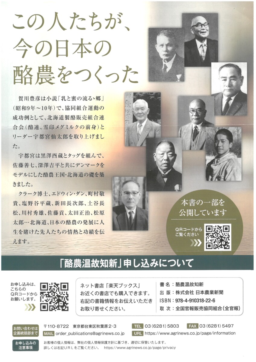 この書籍は日本農業新聞の北海道版連載の「酪農温故知新」や全国版連載の「北の酪農ヒストリー」などを収録したものです。